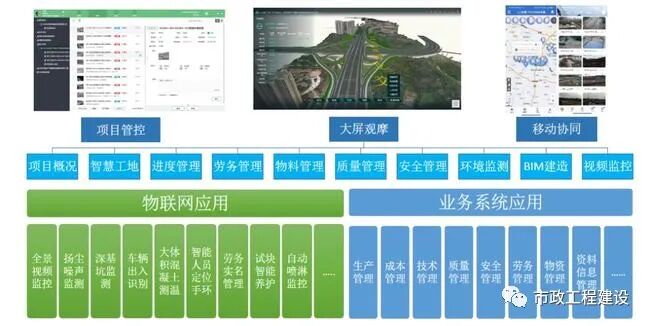 2)管控系统的整体架构由“物联网应用层”和“业务系统应用层”两部分组成。两者通过数据服务器和 Web服务器实现数据的交互和同步,建立项目数据信息与BIM模型的双向链接,实现基于数字化管理平台的新型项目管理。现场管理人员通过移动端进行协同作业,各专业管理人员在权限范围内通过不同功能模块在PC端进行业务工作,现场设备通过物联网将数据传输到系统,数据汇总通过指挥中心分析处理,进行直观展示,领导层能够一眼纵观全局,做出智能化决策。