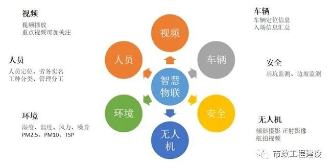 (4)智慧物联 智慧物联子系统下包含视频监控、环境监测、车辆定位、人员管理、基坑监测、无人机6大板块,全面提升了项目的动态管控水平。