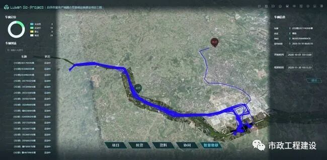 3)车辆定位 现场的渣土车、吊车、挖掘机等93辆机械配备定位设备,通过大屏展示页面,在地图上实时显示各入网车辆的定位和相关即时数据,便于项目部管理。同时可以通过设定任意时间段查询车辆实时轨迹,在地图显示车辆走过的轨迹,开始时间和结束时间锁定车辆行驶的时间段。