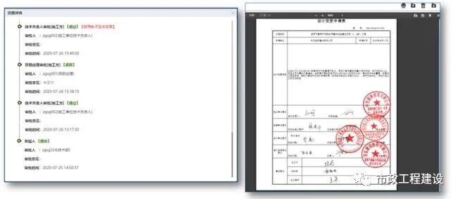 3)审签管控 工程资料(方案、设计变更、质检计量)在线上进行填报并签章审批,阳光签证,流程透明,同时前后审签人员相互监督,采用数字中心认证公安部备案的电子签名、印章,合法并及时高效的完成工程资料的电子化、信息化管理。