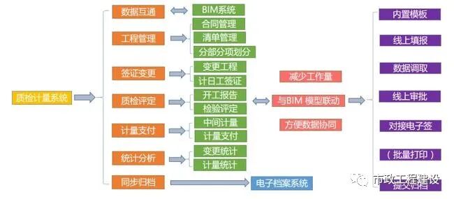 1)功能架构及特点 通过质检计量,可完成工程项目实施过程中的工程信息管理、资料管理和清单管理,评定资料做到数据由测表-检表-评表流转,实现线上资料无纸化填报,变更管理、计量支付、审批。同时,将工程资料与模型关联,进行资料与模型构件的相互反查,结合电子档案应用,实现工程的全过程资料电子化审批与归档管理。