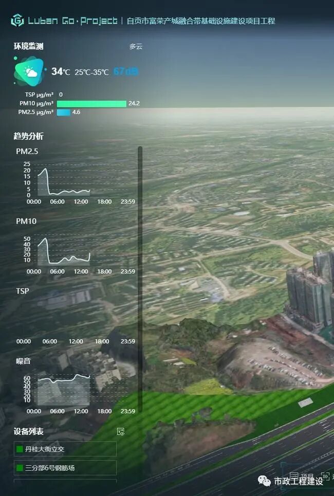 2)环境监测 将布设在现场5个主要出入口的自动监测环境仪接入系统,可对施工现场天气、噪声、温湿度、PM2.5、PM10 、TSP等环境数据实时查看监控,在环境数据超限时,进行预警,现场采取相应措施保证现场施工环境绿色环保。