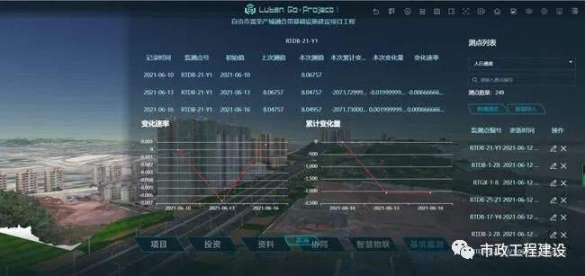 6)基坑监测 将基坑施工的5000余个监测点位数据接入系统,对各监测点的初始值、上次测值、本次测值、本次变化量、累计变化值、变化速率等数据进行分析展示,对基坑施工过程中的变形情况进行动态分析。