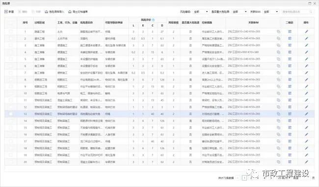2)质量安全管理-危险源评估 系统内置危险源库,项目根据现场施工实际对危险源项进行调整,进行风险识别和评价,并设施对应控制措施,形成风险源清单,可将单项风险源导出二维码张贴在现场对应部位,通过手机等终端扫描即可了解详情。
