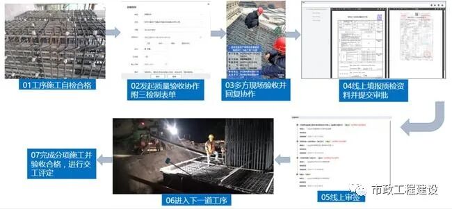 (5)现场管理 1)质量安全管理-质量验收 工序施工完成经总包三检制合格后,通过协同平台发起质量验收协作,通知指定监理工程师及业主代表进行现场验收,验收合格后通过质检计量平台填报检验批并提交审批,待资料审签完成后进入下一道工序,整个分项下工序验收合格后自动生成分项评定表 ,为进度款计量支付提供真实有效的过程资料。