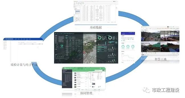 (3)管控系统 1)智慧建造管控系统将基础数据、智慧工地、协同管理、质检计量与电子档案四大子系统的数据进行集成,以指挥中心作为核心对集成数据进行分析和处理,通过线上化施工记录→过程巡检→质量验收→质检表单填审→ 计量支付→ 归档这一线条作为主线对质量与成本进行可视化监管,实现建造过程的智慧化。