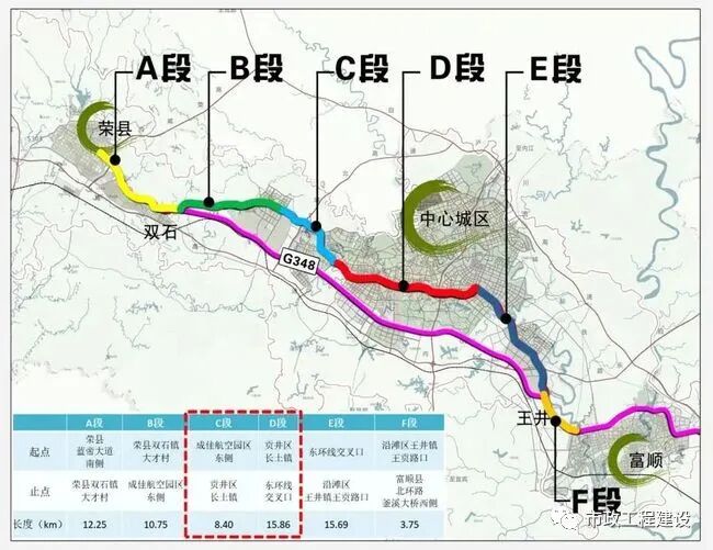 01、项目概况 自贡市富荣产城融合带基础设施建设项目是由自贡市住房城乡建设局作为实施机构组织实施的PPP项目,是省、市重大项目,合同工期2019年11月15日至2022年4月30日,总投资85.6亿,道路全长 24.6km(起于成佳航空园区,止于板仓工业园区,双向十二车道),道路总宽度97米。